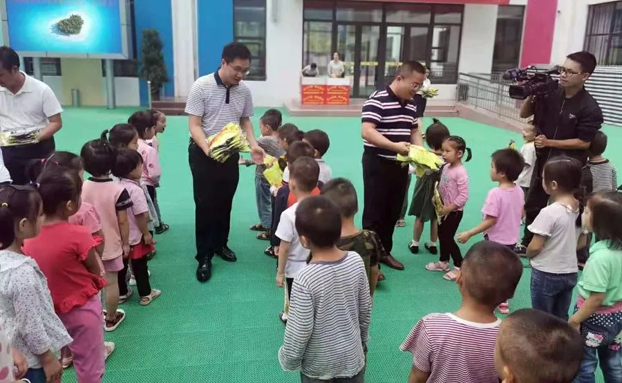 活動中,我們把新校服一一發(fā)到孩子們的手中,孩子們臉上露出開心的笑容。