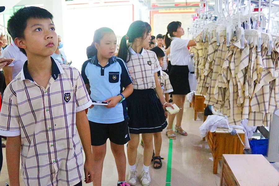 小記者們在生產(chǎn)中心工作人員的引領下,先后參觀了黨建中心、吊掛車間、裁剪車間、線下針織車間、全國學生裝文化展示中心、企業(yè)展示中心等。小記者們圍著解說員爭先恐后地提問,認真地聆聽講解、仔細地觀察、記錄。解說員耐心地向小記者們詳細介紹服裝的每一道工序,小記者們第一次這么近距離接近服裝生產(chǎn)線,一雙雙好奇的眼睛滿是欣喜,親眼見證了一件學生裝各個環(huán)節(jié)生產(chǎn)的過程,了解全國各地一些學生裝文件知識。