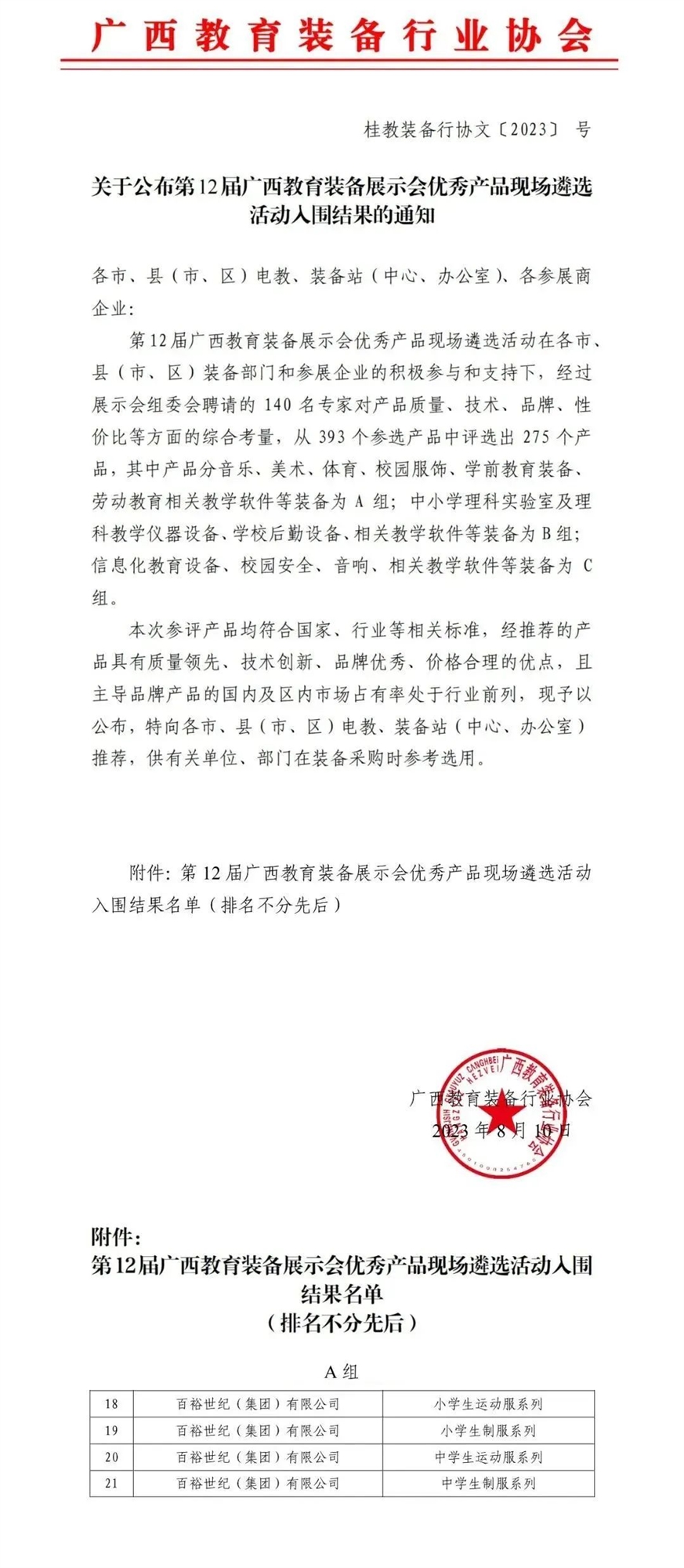 百裕世紀(jì)(集團(tuán))有限公司的4個(gè)校園服飾作品成功入選第12屆廣西教育裝備展示會(huì)優(yōu)秀產(chǎn)品推薦目錄,分別是小學(xué)生運(yùn)動(dòng)服系列、小學(xué)生制服系列、中學(xué)生運(yùn)動(dòng)服系列、中學(xué)生制服系列。