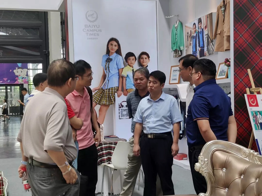百裕集團工作人員向現(xiàn)場來賓講解百裕校園時代當季服裝的品牌理念和款式設計。時尚美觀又不乏個性的校園服飾引起了現(xiàn)場觀眾濃厚的興趣,大家紛紛駐足觀看、詢問交流。期間,工作得到了各級領導的現(xiàn)場指導。