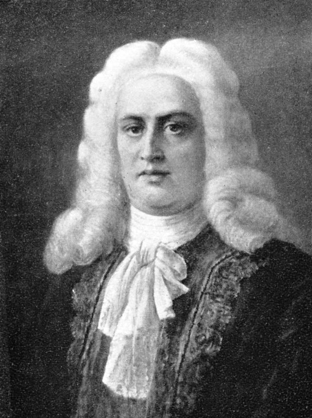 插畫,德國作曲家喬治·弗里德里?!ず嗟聽?/span>(1685-1759)。這個時期領帶的樣式在法朗士小說《領帶》中可見 :" 他的暗綠色上裝的領子豎得很高,他穿著一件南京紫花布背心,黑綢子寬領帶在他的頸子上繞了三圈。"