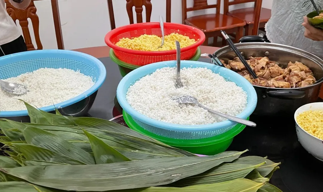 現(xiàn)場準備了豐富多樣的餡料:翠綠的粽葉、飽滿的糯米和綠豆、還有肥瘦相間的豬肉、香甜的海鮮餡料、香菇等。