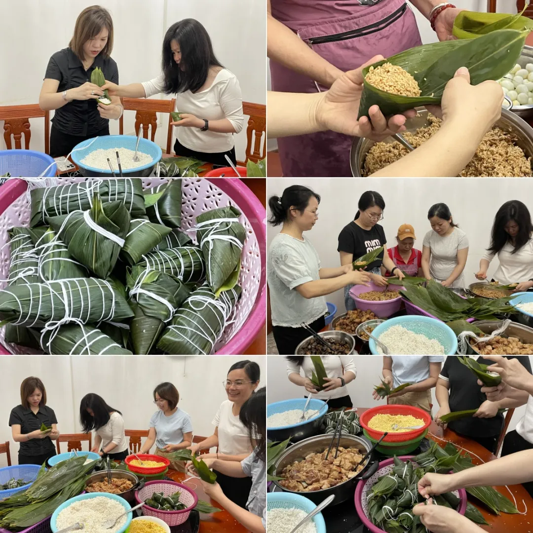 平日忙碌于車間、辦公室的同事們,此刻圍聚一堂。洗凈的粽葉、泡好的糯米、香甜的花生,早已準備就緒。經(jīng)驗豐富的“老師傅”們主動擔起指導重任,手把手傳授包粽技巧;初次嘗試的“新手”們則興致盎然,虛心學習,折葉、填米、放餡、裹緊、扎繩……每一個步驟都凝聚著專注與用心。一時間,歡聲笑語縈繞其間,其樂融融。