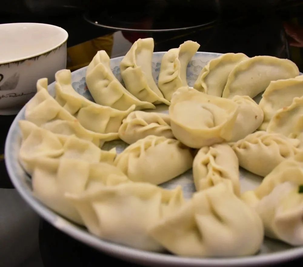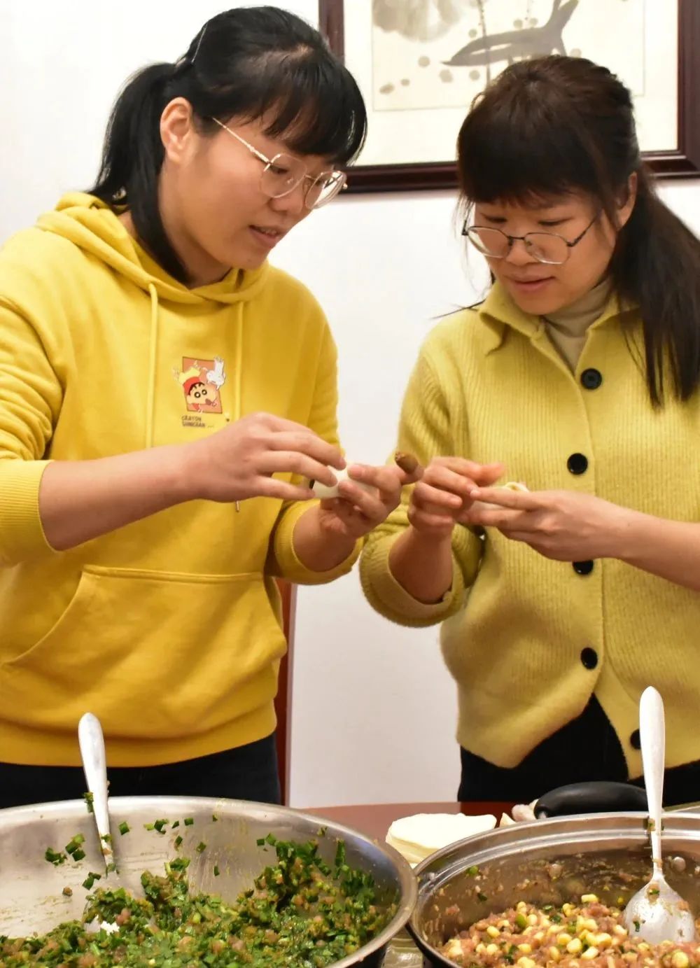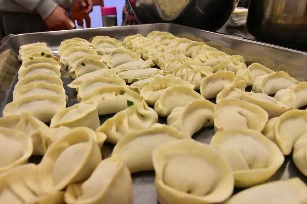 新春伊始,大家齊聚餐廳各顯神通,放餡、捏皮,完整連貫。一會兒功夫,一盤盤大小勻稱、緊實飽滿、形狀美觀的餃子整齊地擺上了臺面:月牙狀、元寶狀、柳葉狀等各式各樣的餃子組成了一桌餃子“全家福”,堪比精美花朵百花齊放。