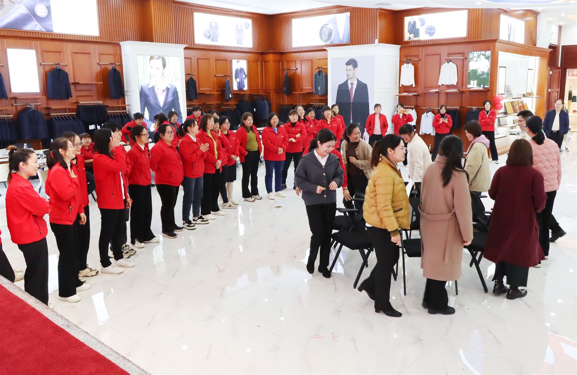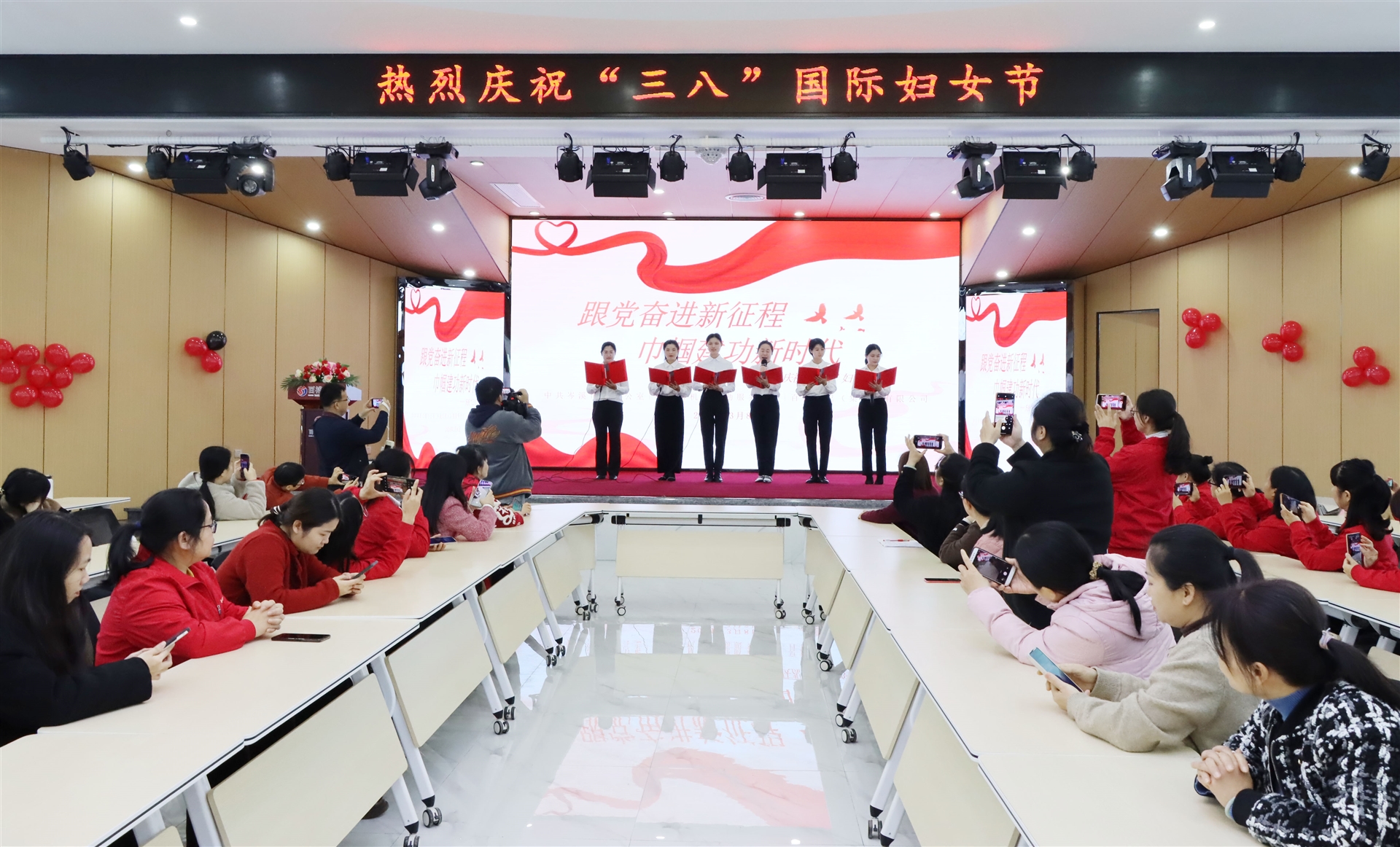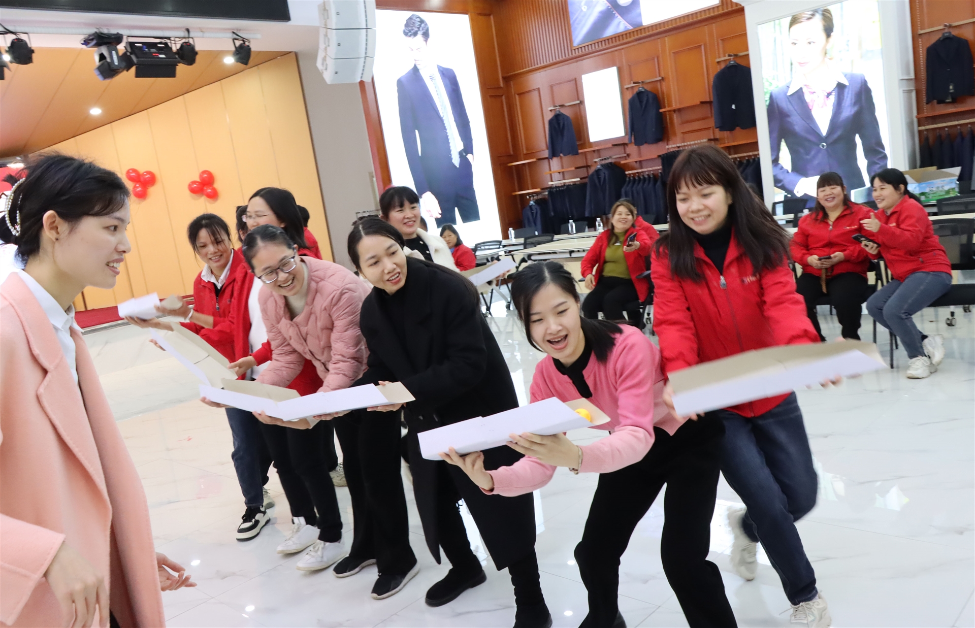 搶凳子比賽中,女士們仿佛變身為矯健的豹子,眼中閃爍著競(jìng)爭(zhēng)的光芒。而珠行萬里活動(dòng)則更像是她們展示優(yōu)雅與力量的舞臺(tái),每一次珠子的傳遞都伴隨著她們的歡笑和尖叫。整個(gè)會(huì)議室仿佛被她們的熱情點(diǎn)燃,熱鬧喜慶的氣氛彌漫在每個(gè)角落。會(huì)議室洋溢著熱鬧喜慶的氣氛,展現(xiàn)了新時(shí)代女性的時(shí)代風(fēng)彩。