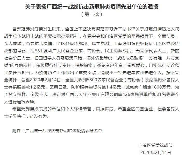2月14日,自治區(qū)黨委統(tǒng)戰(zhàn)部表?yè)P(yáng)447個(gè)抗疫先進(jìn)單位(個(gè)人),百裕集團(tuán)在這次新冠肺炎病毒疫情愛(ài)心公益行動(dòng)中,積極擔(dān)當(dāng)作為,認(rèn)真履行企業(yè)應(yīng)盡的社會(huì)責(zé)任,捐款、捐物等公益表現(xiàn)得到了自治區(qū)統(tǒng)戰(zhàn)部的表?yè)P(yáng),我們將珍惜榮譽(yù),再接再厲,為打贏防控狙擊戰(zhàn)做出貢獻(xiàn)。